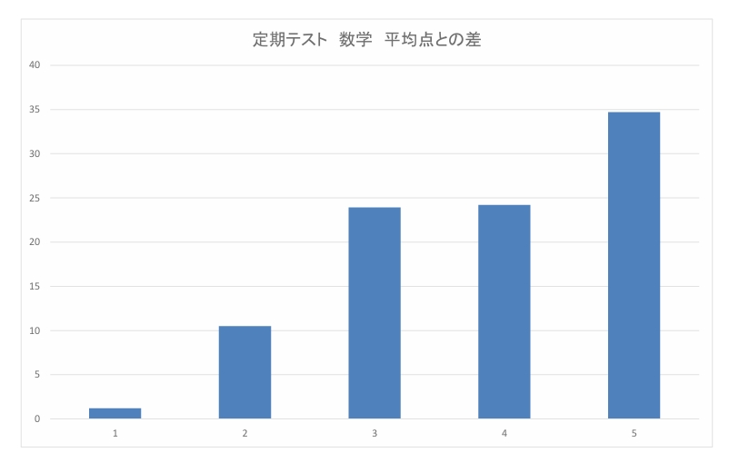 上の画像は、とある生徒さんの定期テストの数学において平均点との差を表したグラフです。 2と3の間で入塾されました。直近では、平均点から約35点高くなりました。